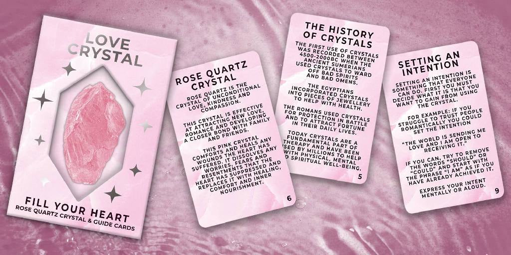 Entdecken Sie das Heilkristall-Set mit Anleitungskarten von Gift Republic. Helfen Sie Ihren Lieben mit einem Rosenquarzkristall bei der Selbstfürsorge oder Selbstliebe. Perfekt für die Heilung von Herzen.