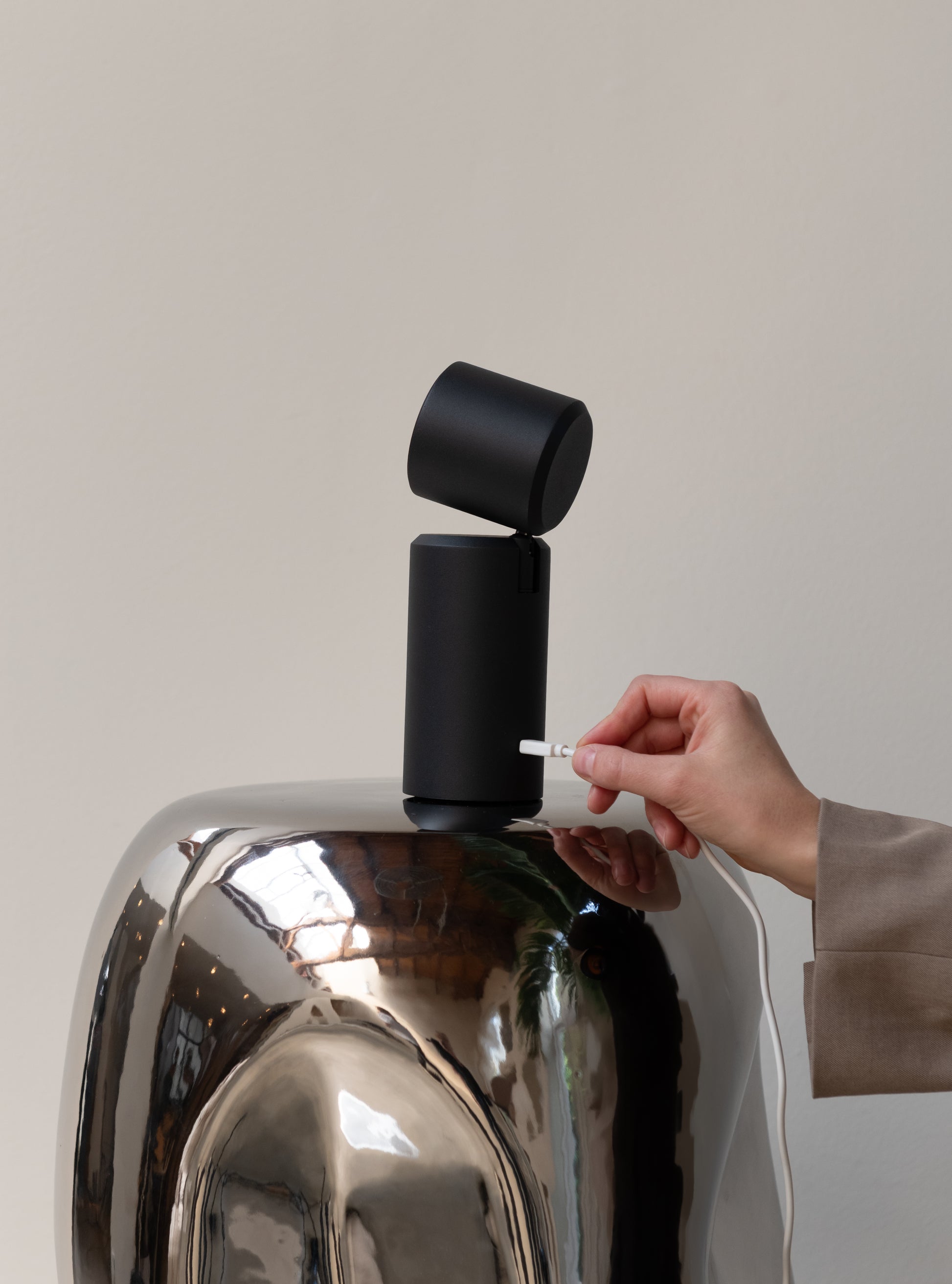 Die Lampe besteht aus Metall und ist über USB-C wiederaufladbar. Der Ein-/Ausschalter ist diskret an der Leuchte selbst angebracht, was die Bedienung erleichtert.