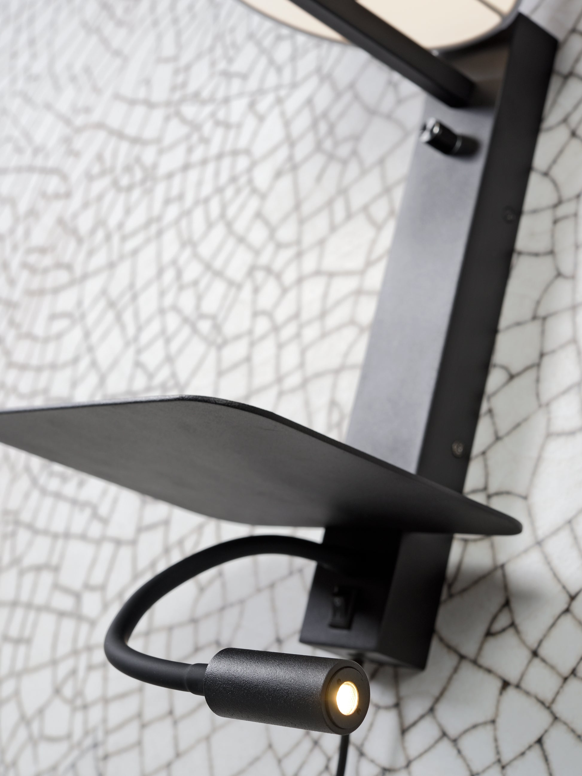 Eine warme und luxuriöse Wandlampe für das Schlafzimmer oder die Leseecke. Das Florence XL in dunklem Leinen ist mit einer dimmbaren Leselampe, Ablage und USB-Anschluss ausgestattet. Die Haube sorgt für eine ruhige Atmosphäre, perfekt für den Abend.