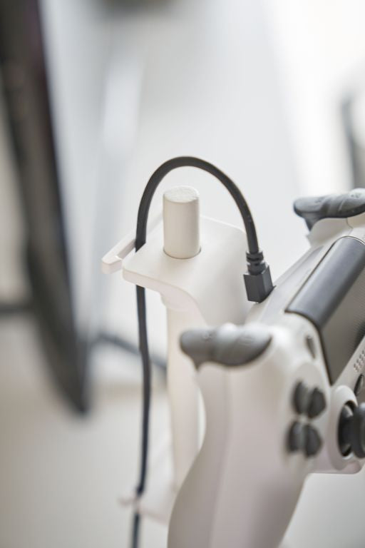 Stylishly store your precious game controllers with this Yamazaki rack. You can adjust the height and position to your liking, and the hooks on the back keep the cable straight while charging. The silicone pads prevent the controllers from sliding down.