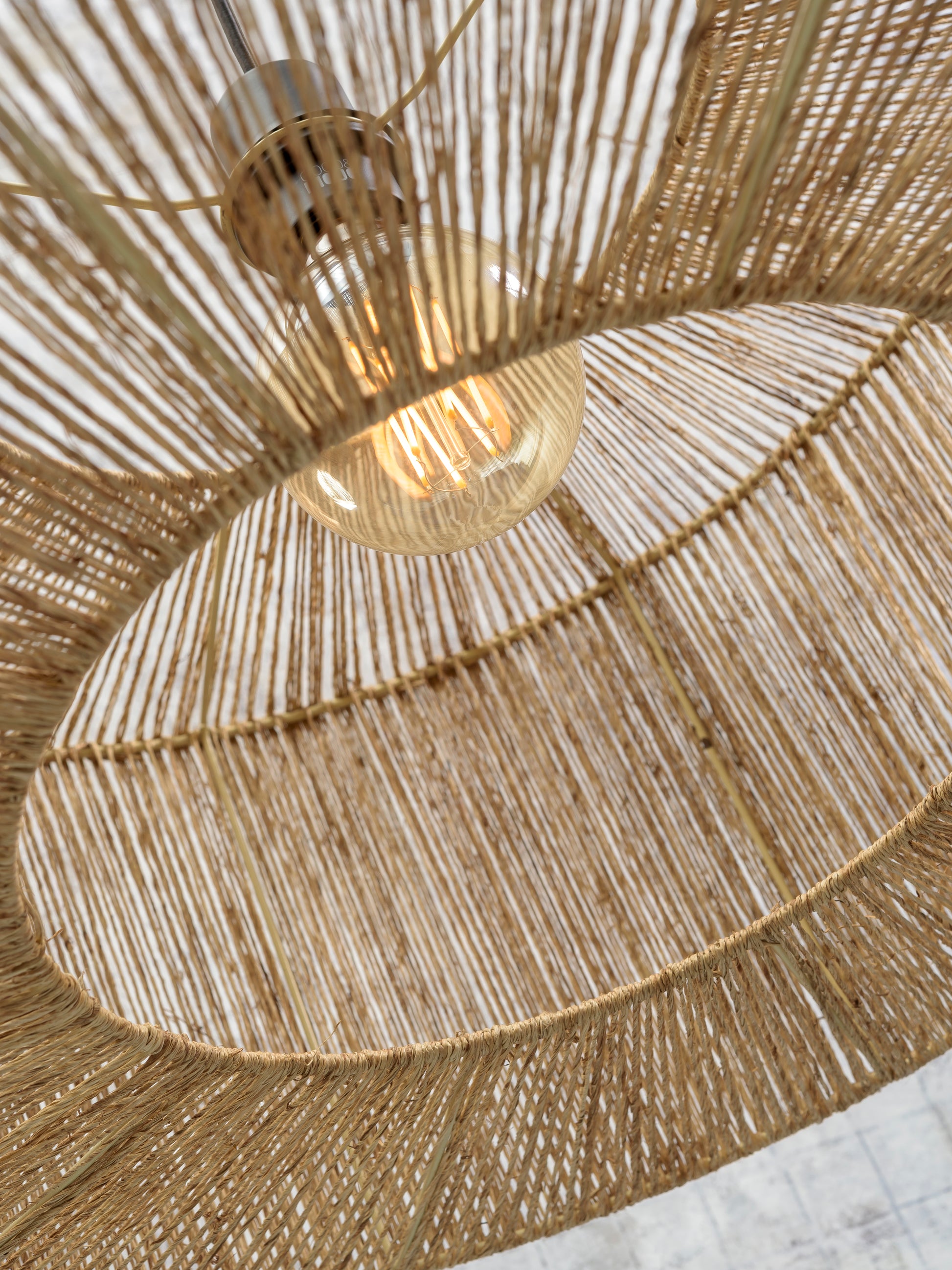 Deze mooie plafonnière is gemaakt van jute en ijzer en is voorzien van een grote E27 fitting voor een lichtbron van maximaal 60 W.