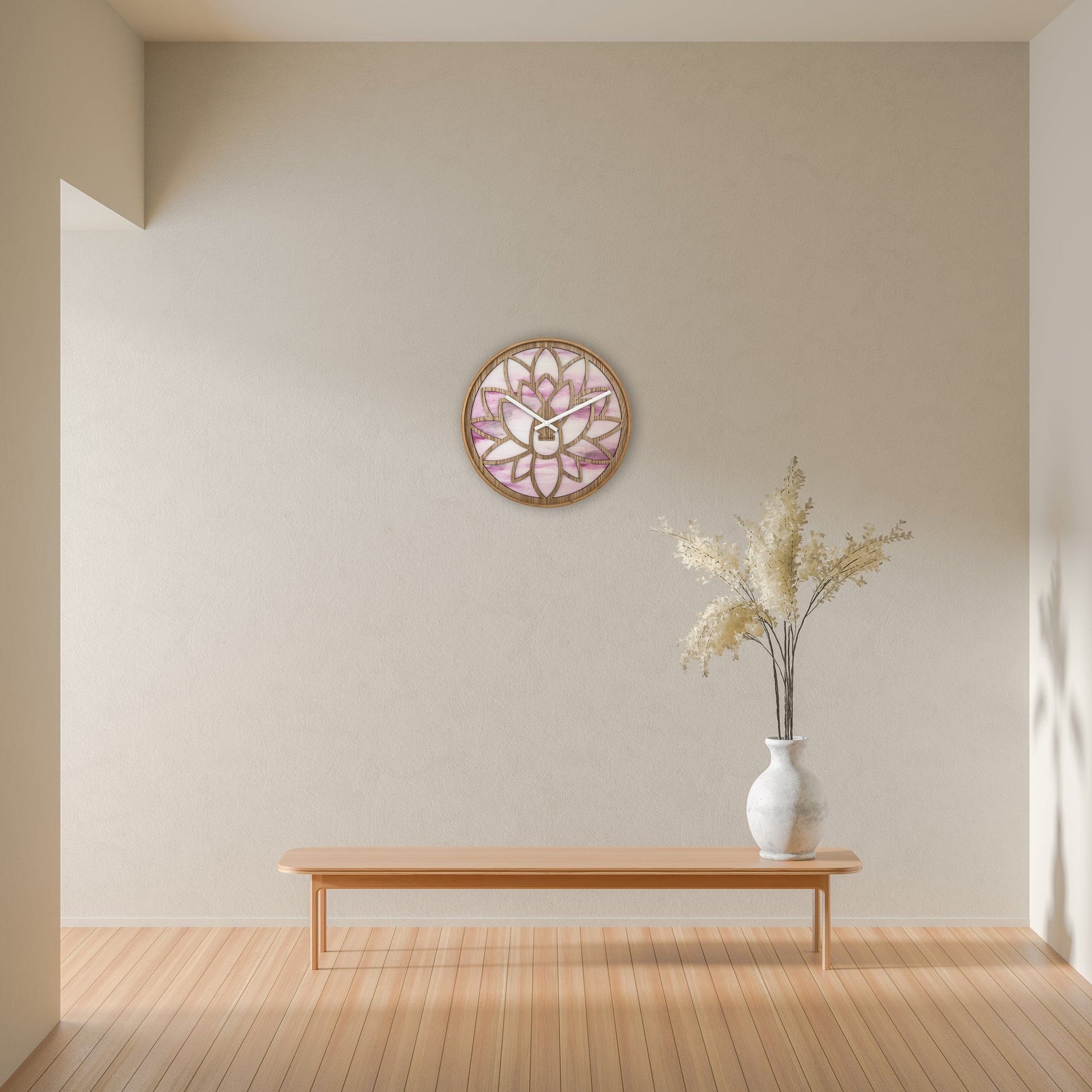 NeXtime Lotus stille wandklok Ø40 cm met natuurlijk houten lotuspatroon op zacht roze aquarelachtergrond. Ontwerp van Jett Scheib; brengt elegantie en rust. Stil uurwerk (geen tik). Werkt op 1×AA-batterij (niet inbegrepen). 2 jaar fabrieksgarantie.